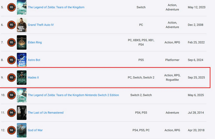 在 OpenCritic 平台上,评分高于 95 分的作品仅有《超级马里奥 奥德赛》、《博德之门3》和《塞尔达传说:旷野之息》,均为顶级 3A 大作。与《哈迪斯2》并列 95 分的前十名作品则包括《荒野大镖客:救赎2》、《艾尔登法环》和《侠盗猎车手4》等重量级游戏。此外,在 Metacritic 上,《哈迪斯2》同样保持95 分的媒体均分。