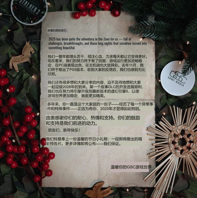 在同步发布的新年社区贺词中,GSC 确认:“首个剧情 DLC 正在顺利开发。同时,我们正在将游戏全面升级至最新版本的虚幻引擎 5(UE5),以让‘Zone’区域在稳定性和视觉效果上更加出色。”