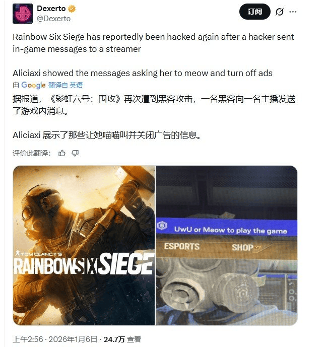 值得一提的是,这已并非该作近期首次出现重大运营事故。早在2025年12月27日,游戏曾因服务器故障导致部分玩家账号异常获得大量“R6点数”及稀有皮肤。事件发生后,育碧紧急关闭服务器与线上商店,并通过数据回滚的方式将账号状态恢复至正常。