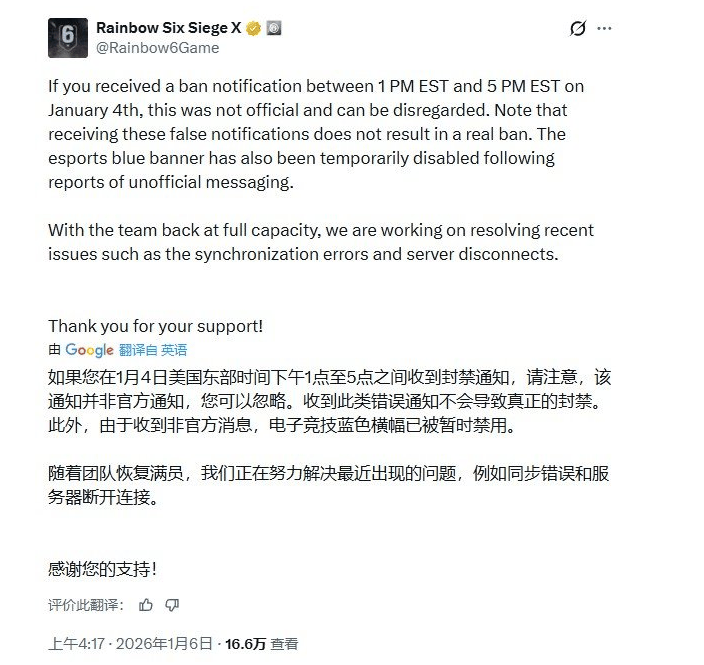 对此,《彩虹六号:围攻》运营团队于1月6日通过官方社交媒体发布声明回应称,1月4日特定时间段内出现的封禁通知并非官方发出,而是错误或虚假信息,实际并不会对玩家账号造成封禁影响。官方同时表示,随着团队全面恢复运作,正在积极排查并修复近期出现的同步异常、服务器断线等问题。