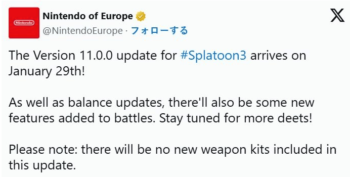 任天堂于 1 月 13 日正式宣布,《斯普拉遁3》将于 1 月 29 日推出大型更新 Ver.11.0.0。官方表示,本次更新不仅会带来多项对战平衡性调整,还将涉及部分系统层面的改动;同时,根据欧洲任天堂发布的公告,本次更新还将追加全新的对战功能。